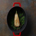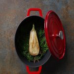 Poklopac sa izbočinama na unutrašnjoj strani prisiljava kapljice vode (pare) da padnu, održavajući jelo vlažnim i aromatičnim.