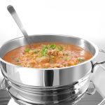 Okrugli spremnik za supu smešten je u veliku vodenu tavu, dovoljno toplu da supu drži vrućom.